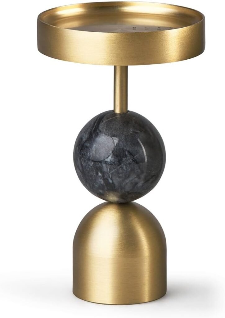 Cluster a set of three candlestands on a marble tray, then place a single brass candlestand on each side of the centerpiece to create symmetry without being predictable.